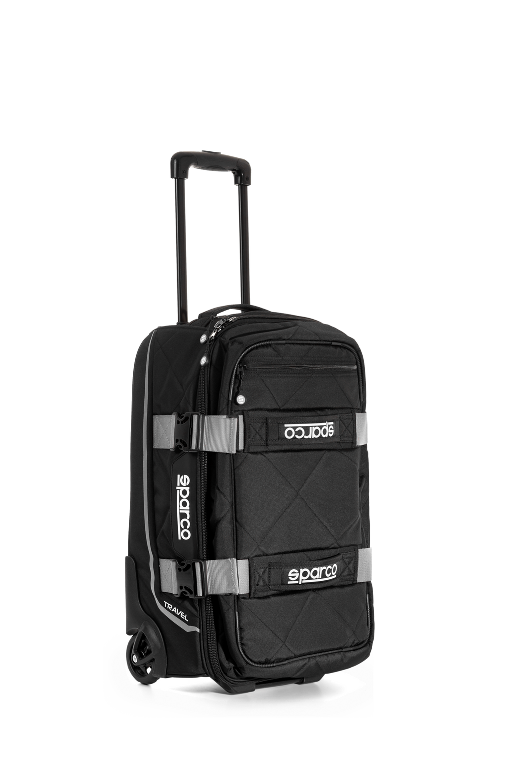 The Travel is the first Sparco rolling bag specifically designed as "Carry-on" size for air travel. The Travel is a stylish bag that features multiple internal pockets that with protective padding around the duffle bag and a reinforced under compartment. Two Harness straps keep contents inside. A telescoping handle make it easy to lift an roll. Available in 2 colors: black/red or black/silver.